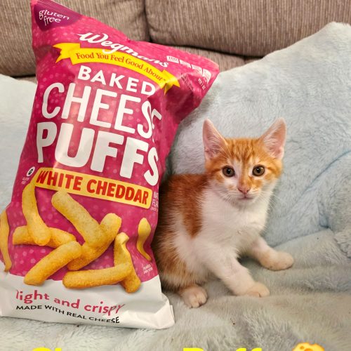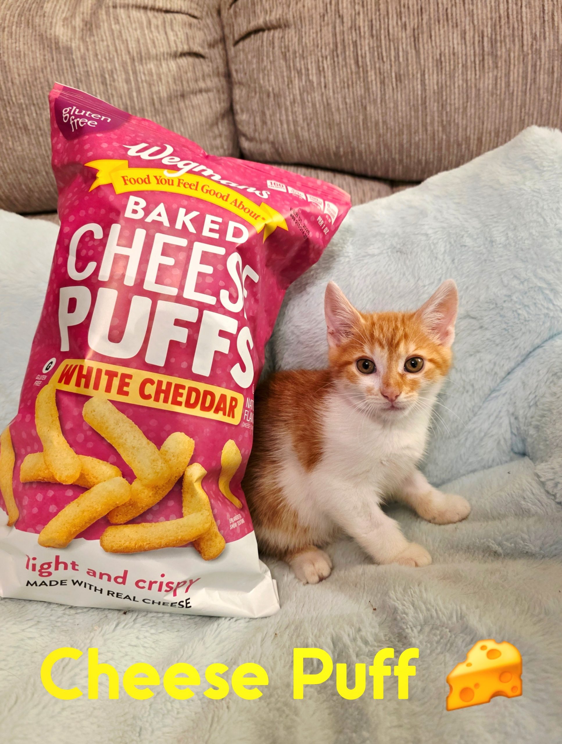 HI my name is Cheese Puff and I am an adorable orange and white girl! I was hit by a car and had a broken jaw, but it is all healed now and I am perfect!