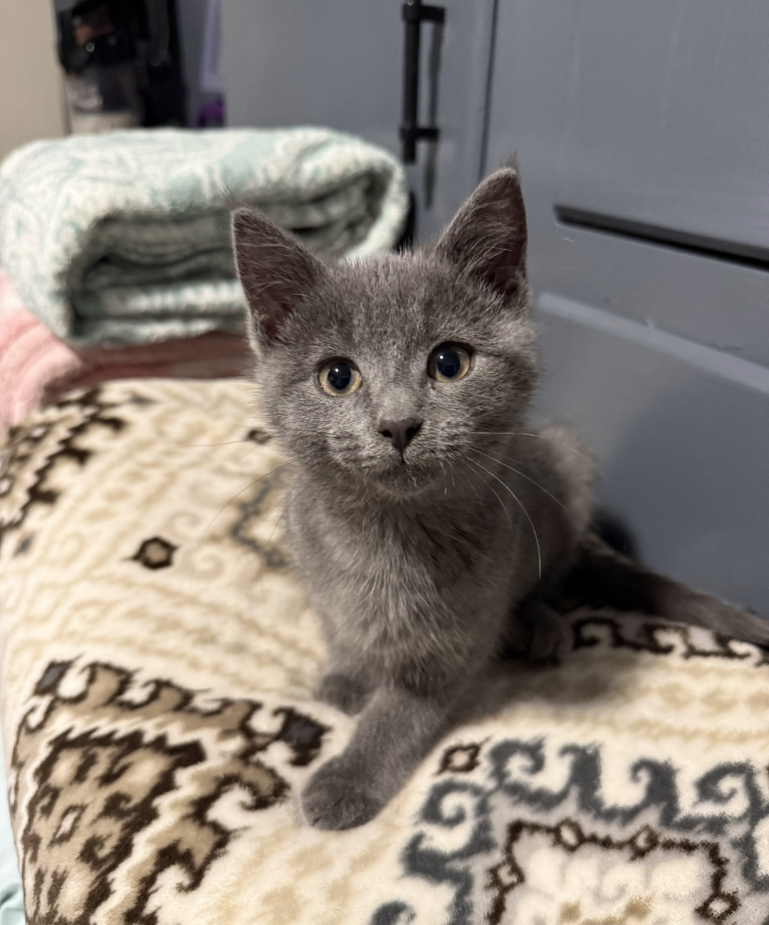 My name is Ortega and I am the friendliest little grey girl you could ever meet! I am a lap kitty who loves to be held and petted! I purr as soon as you touch me!