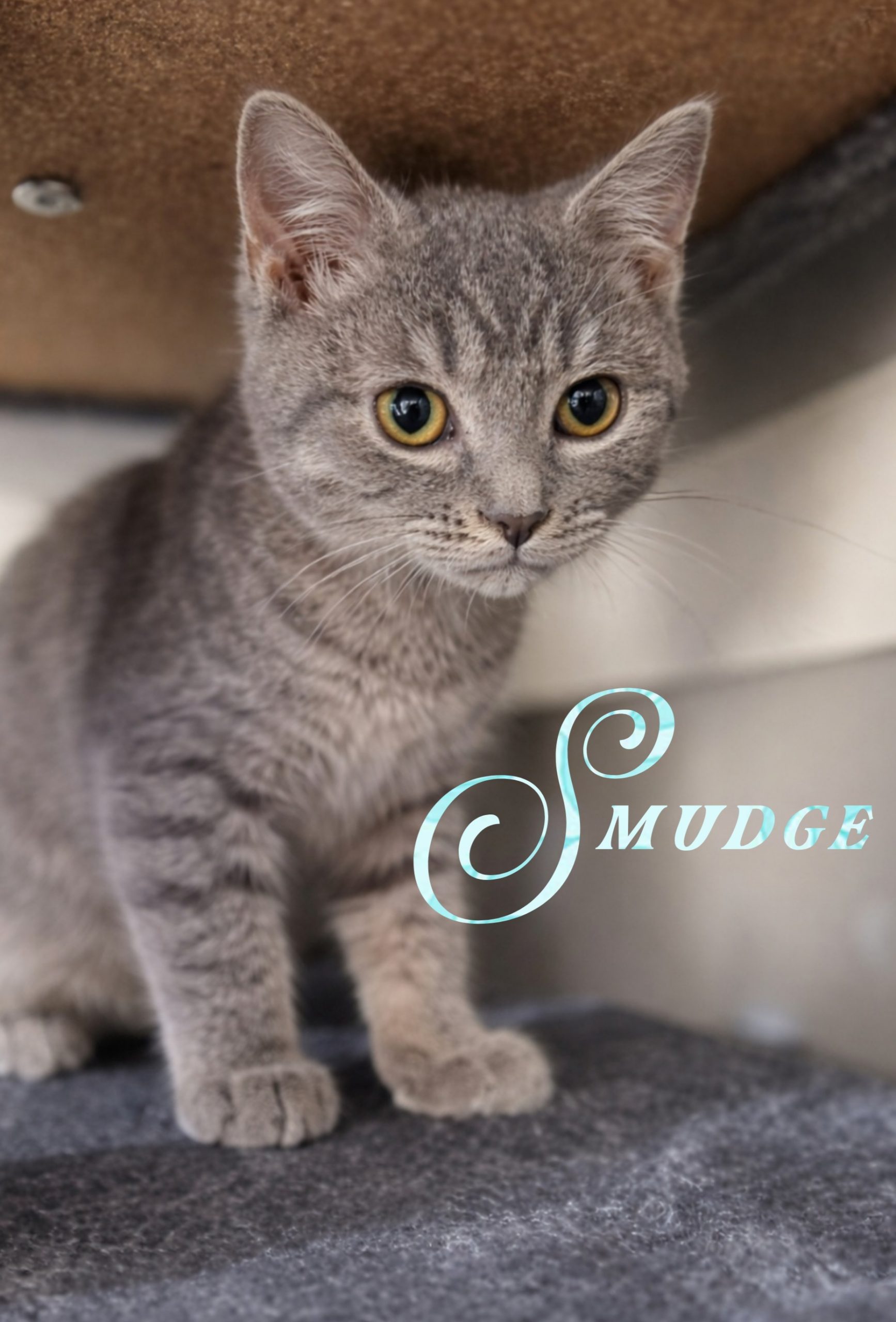 My name is Smudge and I am a super friendly gray tabby boy! I get along well with other cats and even dogs! I purr when you touch me and love to cuddle on your lap!